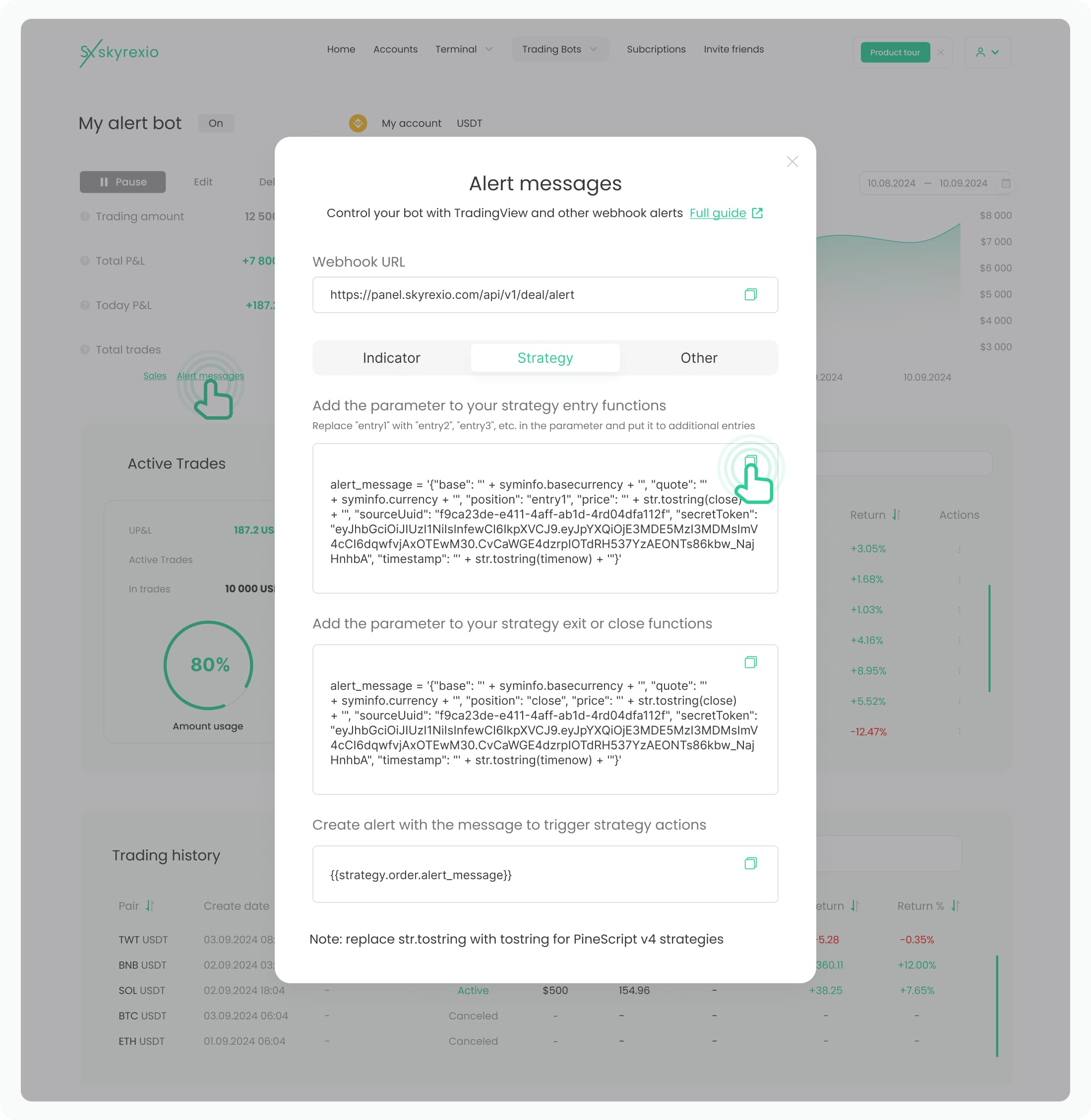 1. Click Alert Messages in your bot, copy webhook URL, strategy action parameters and alert message